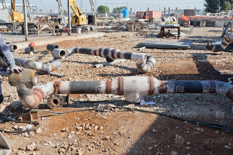 Элементы трубопровода находятся на строительной площадке на фоне процесса сборки металлоконструкций