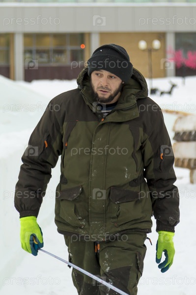 Сборщик в комбинезоне на территории ледового городка