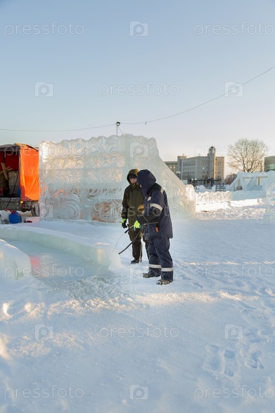 Рабочий-установщик со шлангом льет воду на лед