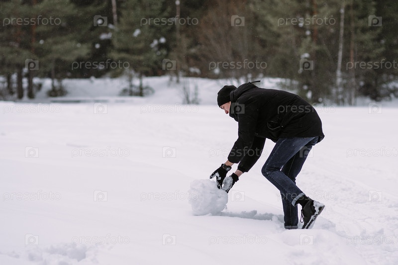 Пара подростков вместе строят снеговика зимой