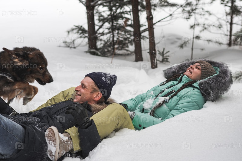 Милая пара развлекается со своей собакой в зимнем лесу