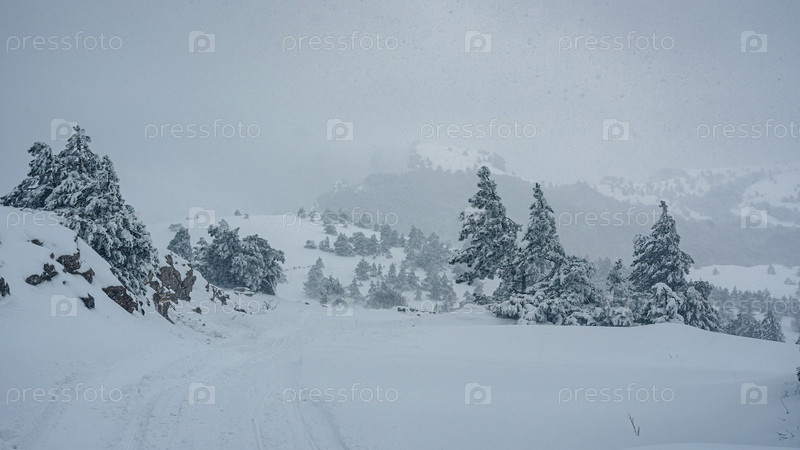 Заснеженный лес на вершине горы Ай-Петри после метели. Крым