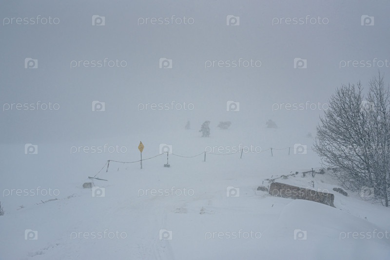 Заснеженный лес на вершине горы Ай-Петри весной в метель. Крым