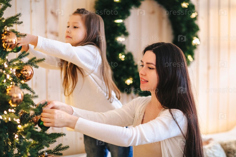 Молодая семейная мать и маленькая дочь украшают елку дома, вешают елочные шары