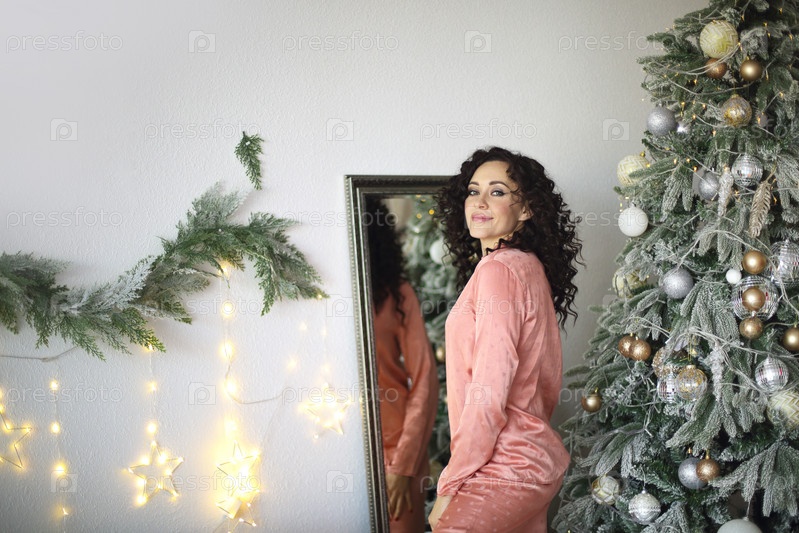 Молодая привлекательная счастливая женщина в пижаме в рождественское утро возле елки дома