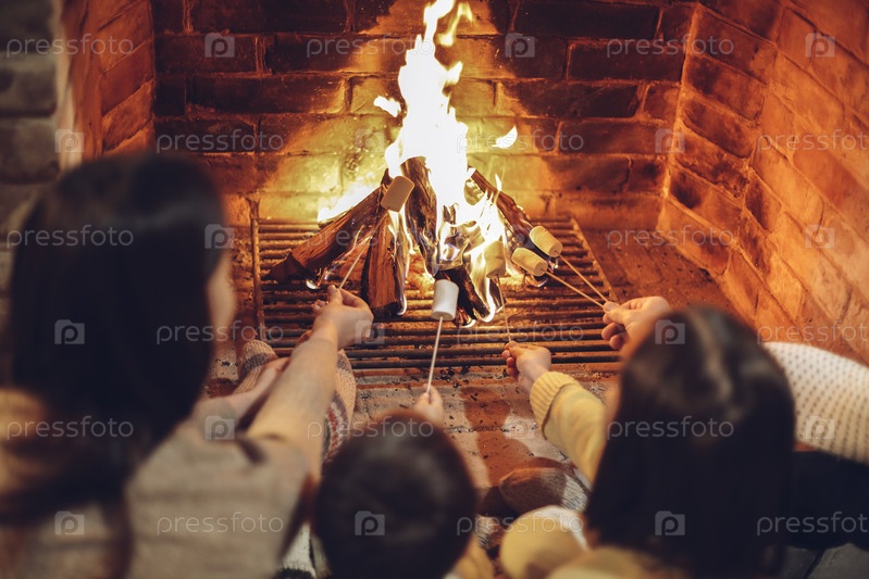 Счастливые молодые семейные родители с двумя маленькими детьми собираются вокруг кирпичного камина в уютном и теплом загородном доме во время рождественских праздников