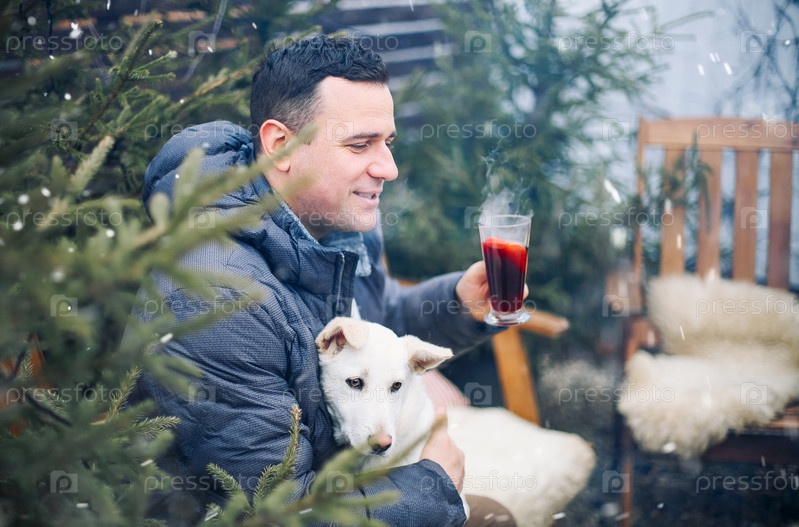 Счастливый мужчина сидит на деревянном стуле с собакой на коленях на заднем дворе, зимой пьет горячий ароматный грог