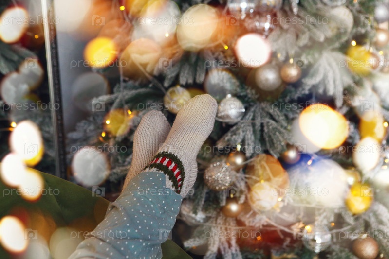 Женщина в теплых вязаных носках отдыхает возле елки. Уютный рождественский фон с женскими ногами