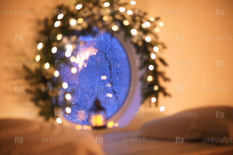 Рождественский домашний декор. Атмосферное фото в помещении со старым винтажным светящимся фонарем у круглого окна, украшенного веткой дерева и рождественскими огнями. Создание праздничного настроения во время зимних каникул в доме