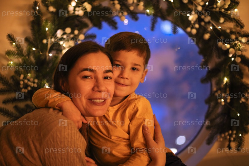 Портрет матери семьи с маленьким сыном, смотрящим в окно в канун Рождества дома, избирательный фокус. Мама и ребенок сидят на подоконнике со старым светящимся фонарем в рождественский вечер