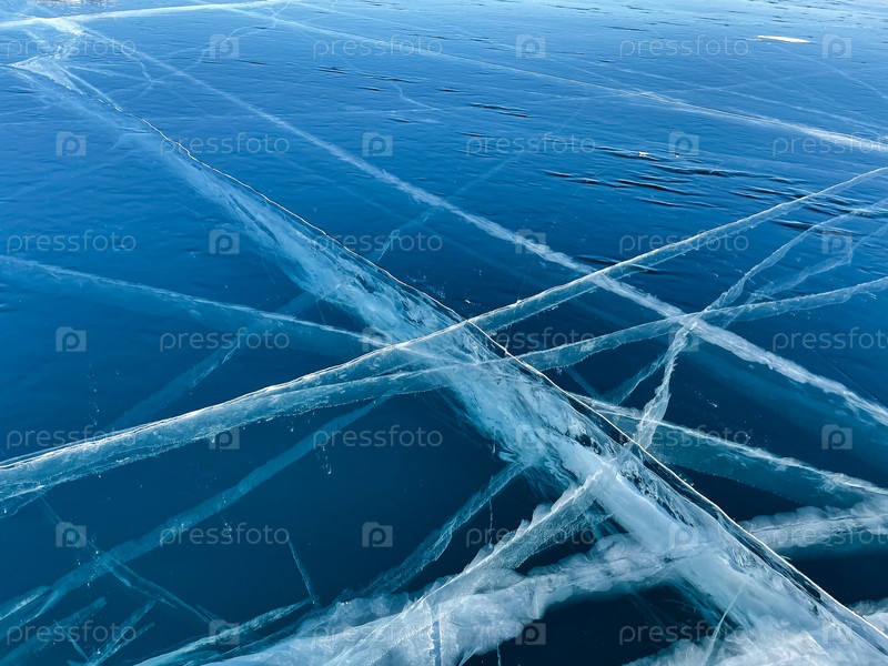 Текстура красивого голубого льда с трещинами и пузырьками воздуха в замерзшем озере