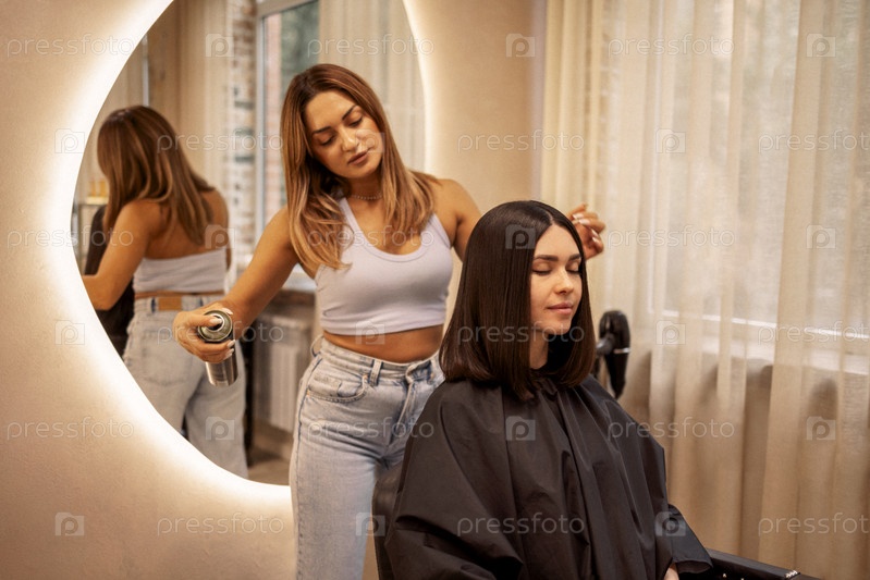 Женщина-парикмахер фиксирует волосы клиентки спреем и ухаживает за ней во время укладки прически