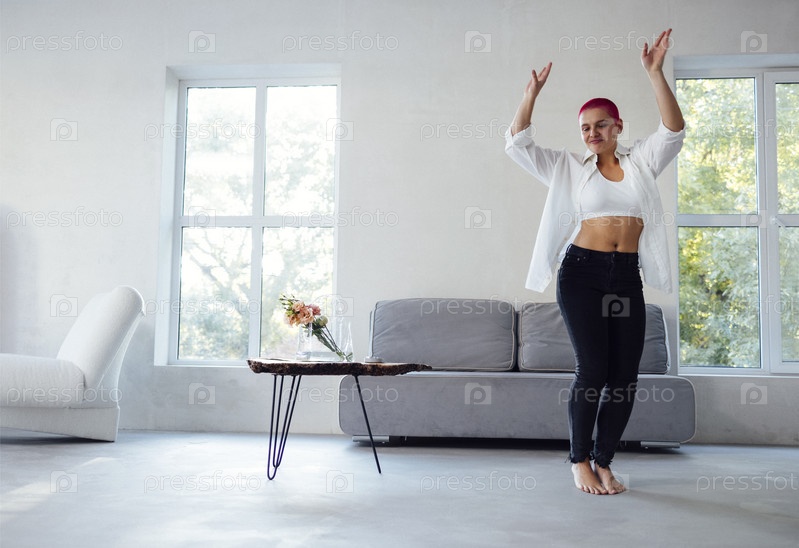 Счастливая красивая женщина меломан в повседневной одежде, поднимающая руки