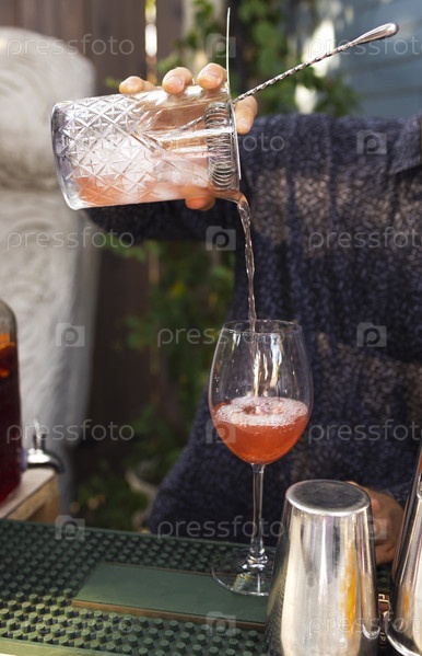 Стаканы коктейлей в баре. Бармен наливает бокал игристого вина с красным алкоголем