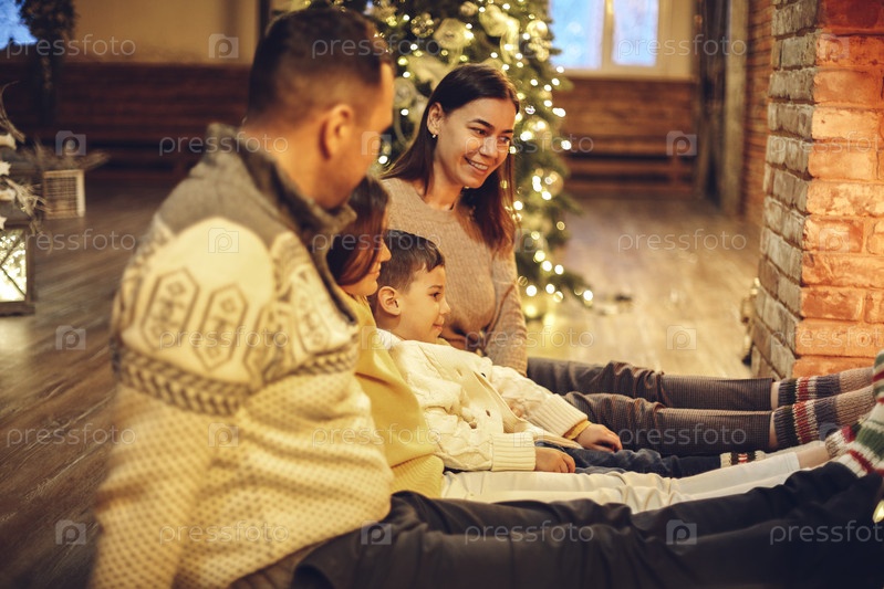 Счастливые молодые семейные родители с двумя маленькими детьми собираются вокруг кирпичного камина в уютном и теплом загородном доме во время рождественских праздников