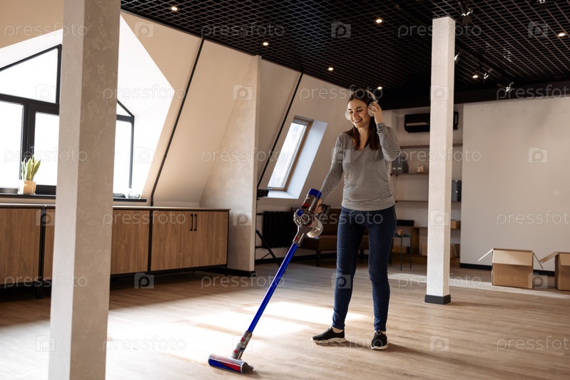 Счастливая брюнетка слушает музыку в наушниках и танцует во время уборки пылесосом пола в уютной комнате