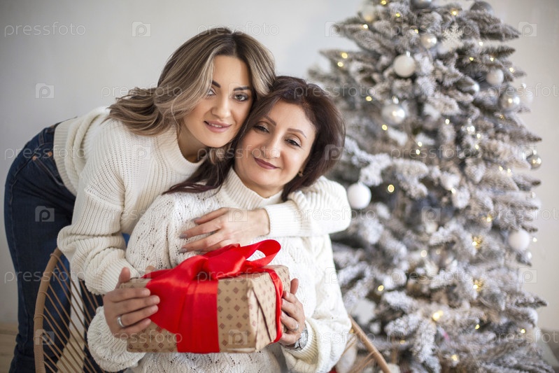Счастливая зрелая мать и взрослая дочь обмениваются рождественскими подарками и обнимаются, сидя дома возле елки. Молодая женщина поздравляет старшую маму с Новым годом. Семья наслаждается зимними каникулами