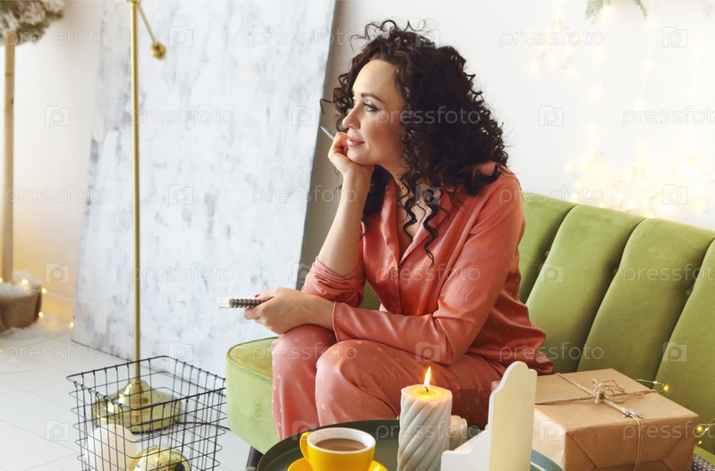 В поисках вдохновения. Молодая творческая женщина в мыслях сидит на диване с блокнотом и ручкой