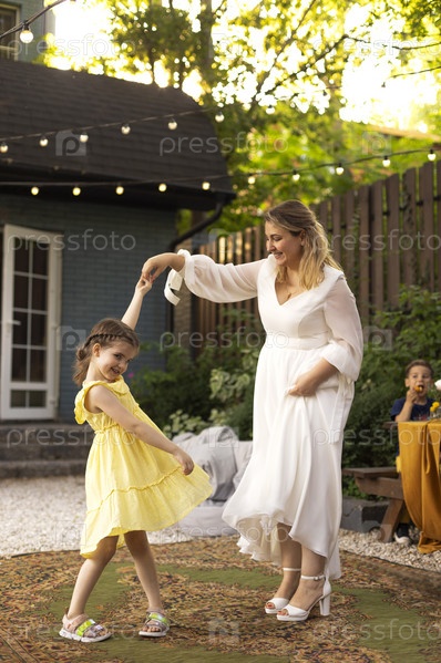 Мать и маленькая дочь веселятся на свежем воздухе. Свадьба