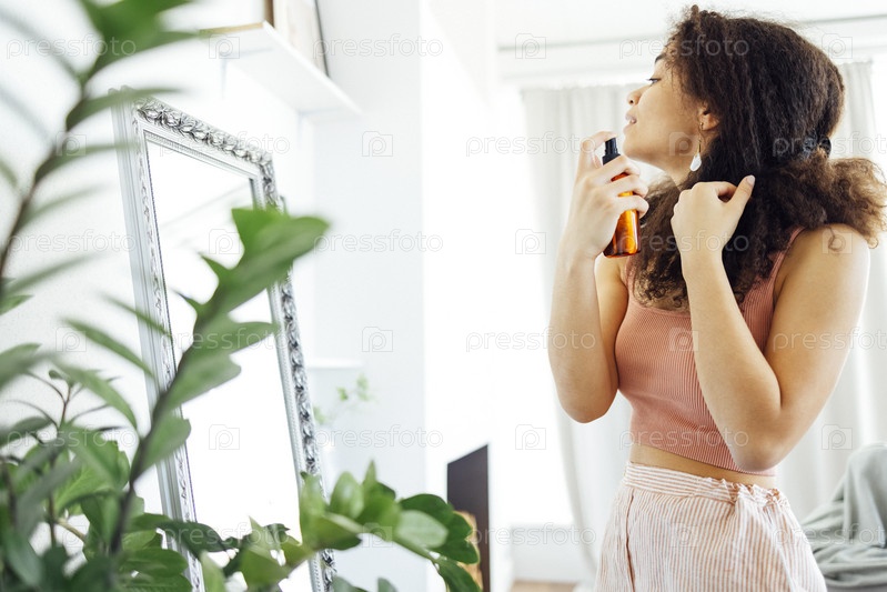 Красивая женщина смешанной расы наносит увлажняющий спрей на вьющиеся волосы