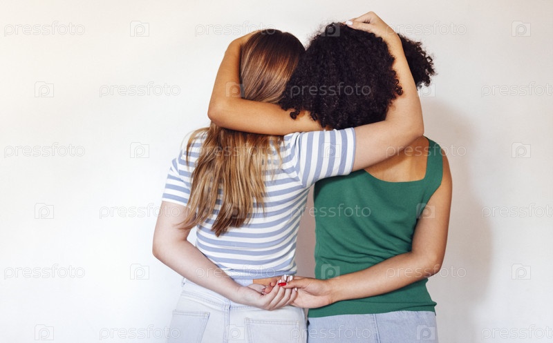 Вид сзади двух лучших друзей девочек-подростков, держащихся за руки за спиной и обнимающихся