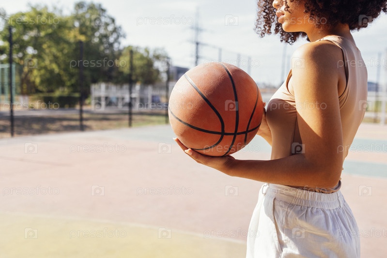Стильная крутая девушка-подросток собирается на баскетбольной площадке, играет в баскетбол на открытом воздухе
