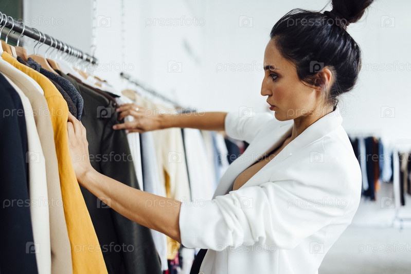 Красивая молодая женщина, стоящая перед вешалкой и выбирающая одежду