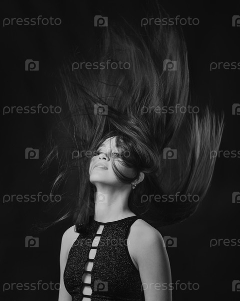 Студийный портрет красивой брюнетки с длинными волосами, летящими на черном фоне