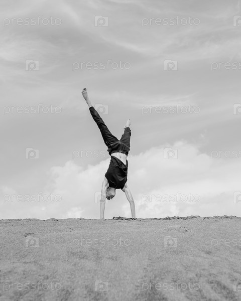 Молодой человек стоит на руках на песке в пустыне