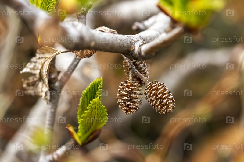 Маленькие сосновые шишки на ветке. Крупный план изображения