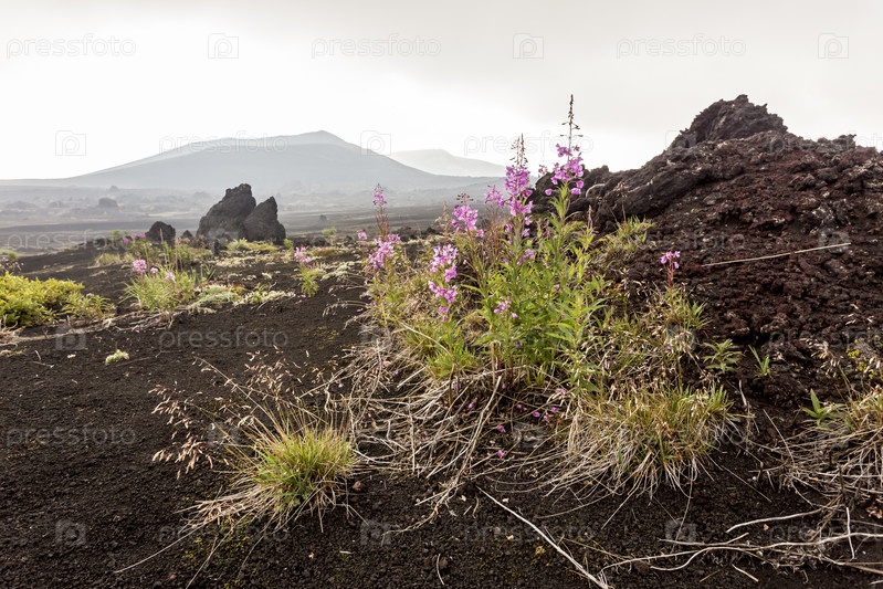 Вулканический пейзаж у вулкана Толбачик в пасмурную погоду. Полуостров Камчатка, Россия