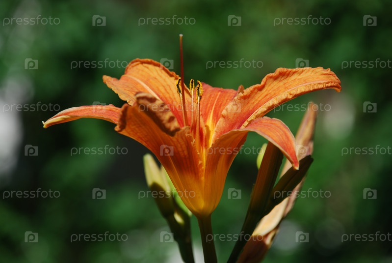 Большой оранжевый цветок лилии. Летний солнечный день. Яркий цветок лилии оранжевого цвета с большими лепестками и длинными тычинками расцвел на зеленом стебле