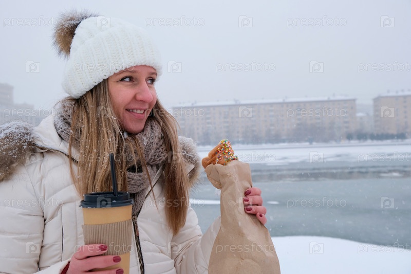 Молодая женщина ест крендель со сладостями на улице во время снегопада. Уличная забегаловка. Зима. Женщина ест вкусную еду