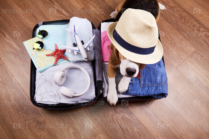 Собака-бигль в соломенной шляпе лежит в чемодане с вещами и аксессуарами для отдыха