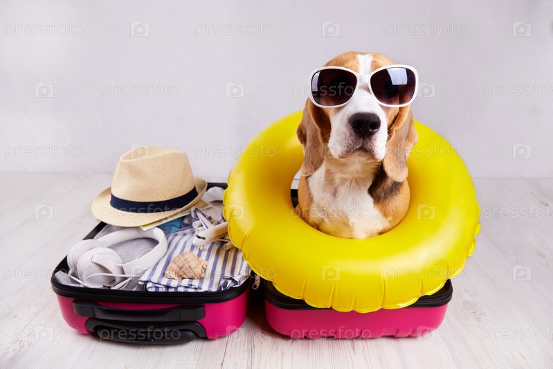 Собака-бигль в солнечных очках и плавательный круг сидит в открытом чемодане