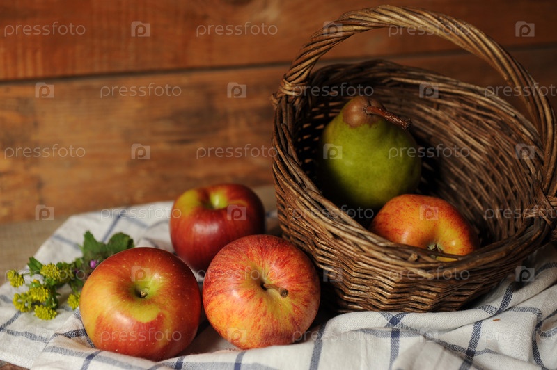 Натюрморт с грушей и красными яблоками в корзине