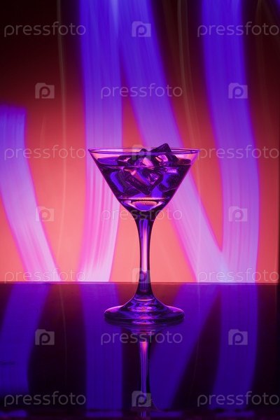 Бокал для мартини со льдом. В баре. На фоне неонового света