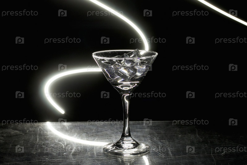 Бокал для мартини со льдом. В баре. На фоне неонового света