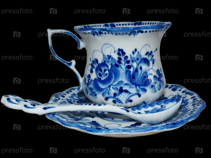 Чашка с блюдцем, изолированная на черном фоне. Домашняя посуда в стиле классической Гжели. Гжель - русский народный промысел гончарного и фарфорового производства и разновидность русской народной росписи