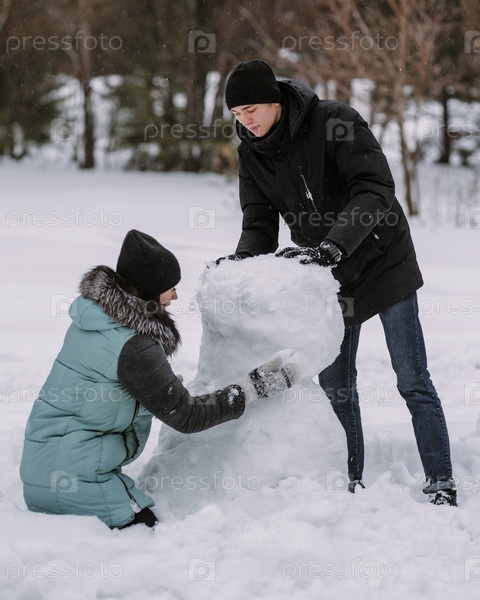 Пара подростков вместе строят снеговика зимой