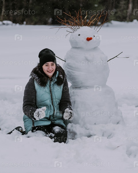 Пара подростков вместе строят снеговика в зимнем лесу