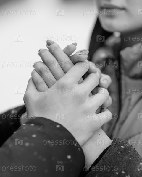Пара подростков, гуляющих зимой. Парень греет руки девушке