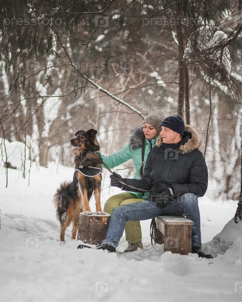 Счастливая молодая пара гуляет с собакой в лесу в зимний день