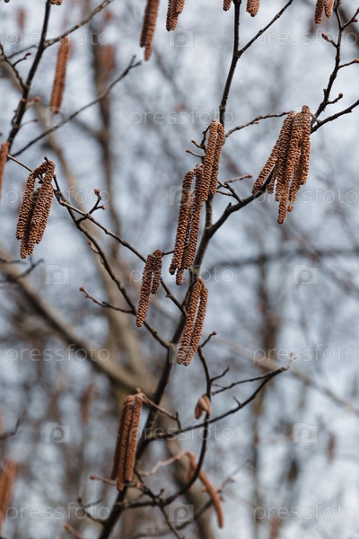 Цветочные серьги на ветках ореха Coryllus avellana весной