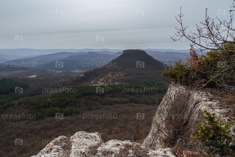 Вид с Бешик-Тау на священную гору караимов весной. Бахчисарай, Крым