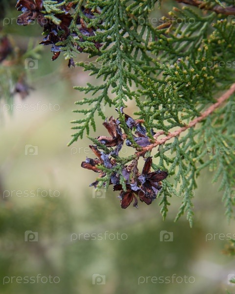 Ветка туи с шишками весной