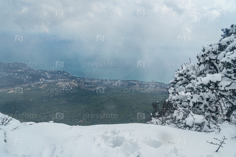 Живописный вид на город Ялту и Черное море покрыло снежную вершину горы Ай Петри в Крыму весной