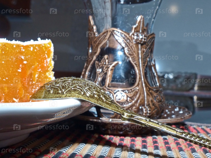 Рахат-лукум из лепестков роз и стакан для чая - армуда (армуду, богмалу). Восточные сладости. Крупный план