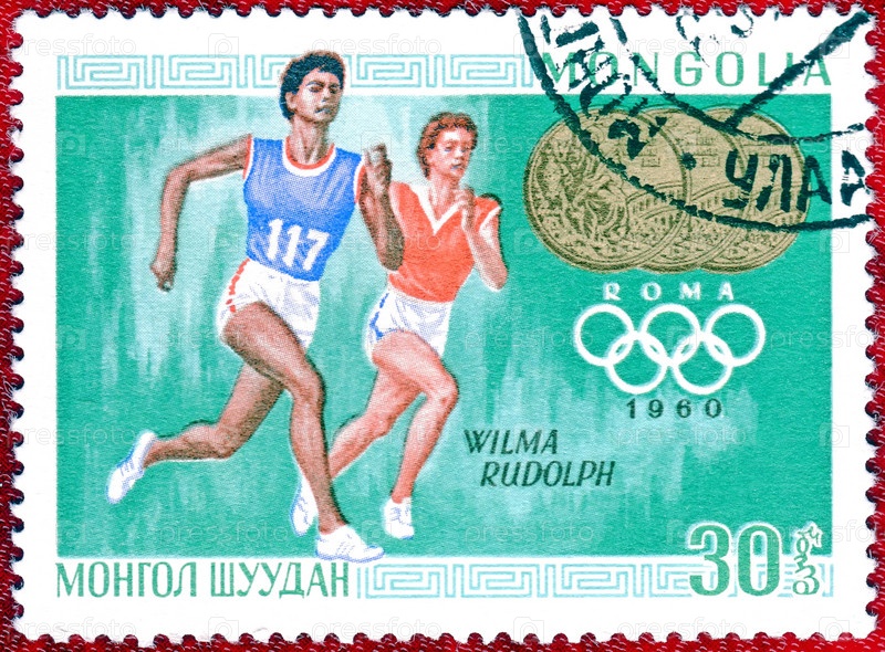Монголия, около 1960: Почтовая марка с изображением трехкратной чемпионки Вильмы Рудольф (легкая атлетика)