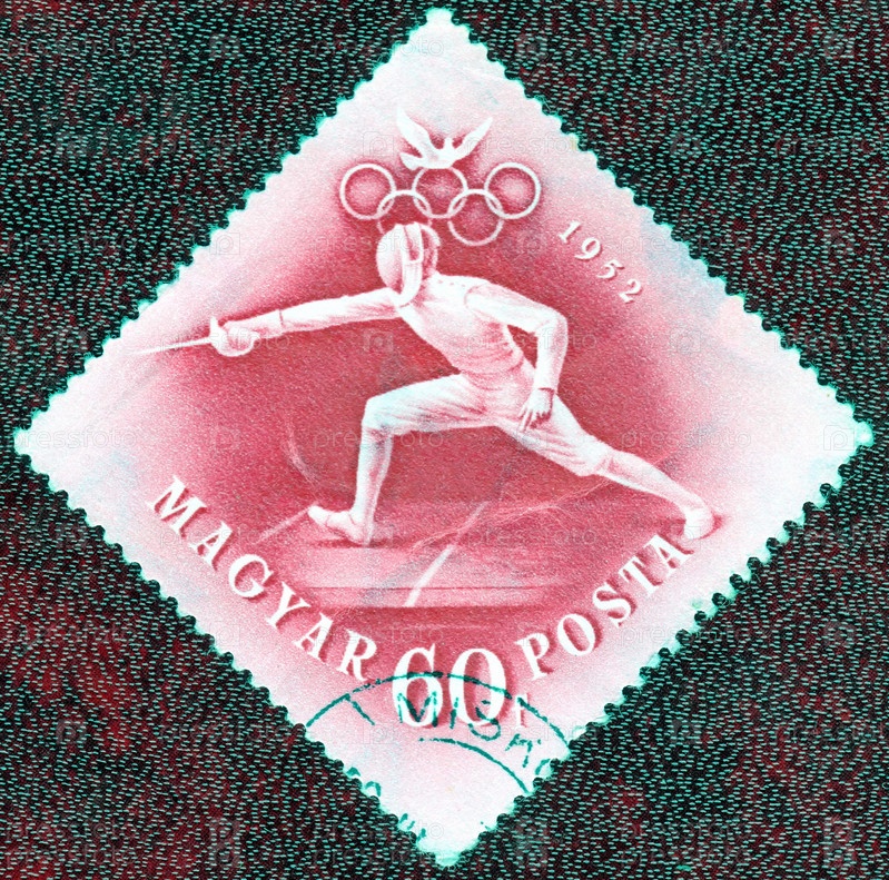 Венгрия, около 1952 года: почтовая марка с изображением фехтовщика из серии 'XV Олимпийские игры в Хельсинки'